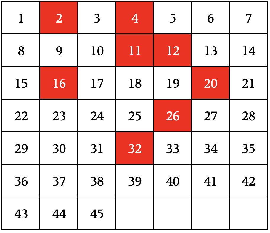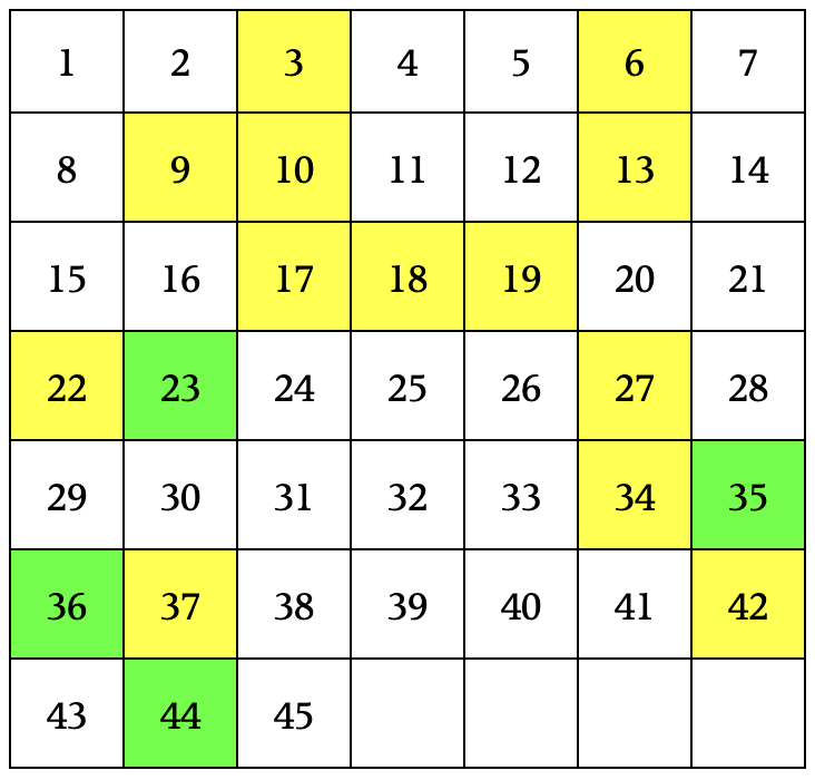 3, 6, 9, 10 / 13, 17, 18, 19 / 22, 23, 27 / 34, 35, 36, 37 / 42, 44