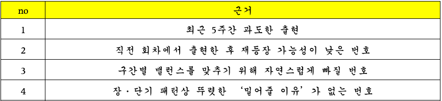 - 직전 회차에서 출현한 후 재등장 가능성이 낮은 번호